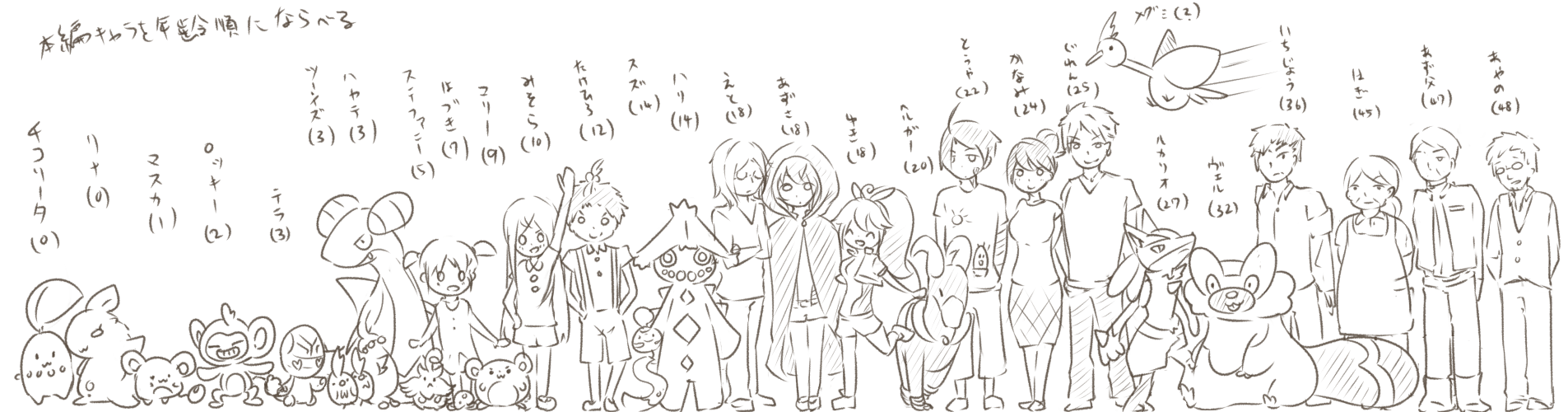 敬老の日タグを見てうちで一番年齢高いの誰だっけ……という発想からきたイラストなんですが全員並べてたかさくらべ表をつくるという取り組みは本当にずっと前からやりたかったので(というかたかさくらべ表が好きなんですよ 分かりますかこの気持ちが)いろいろミスってますが良い機会で描けたのがとても満足 なんかこんな雑絵でも全キャラ集合(してないけど)描くのってすごいアレですね。。なんか描いてる途中は疲れてたけど描き終って眺めた時の満足感凄い。。月蝕でこんなサブ入りの集合絵描く日が来るとは思わなかったし 原寸大で拡大してみるよりもブラウザサイズのまま眺めるのがたのしい いっぱい描いたな~って感じで